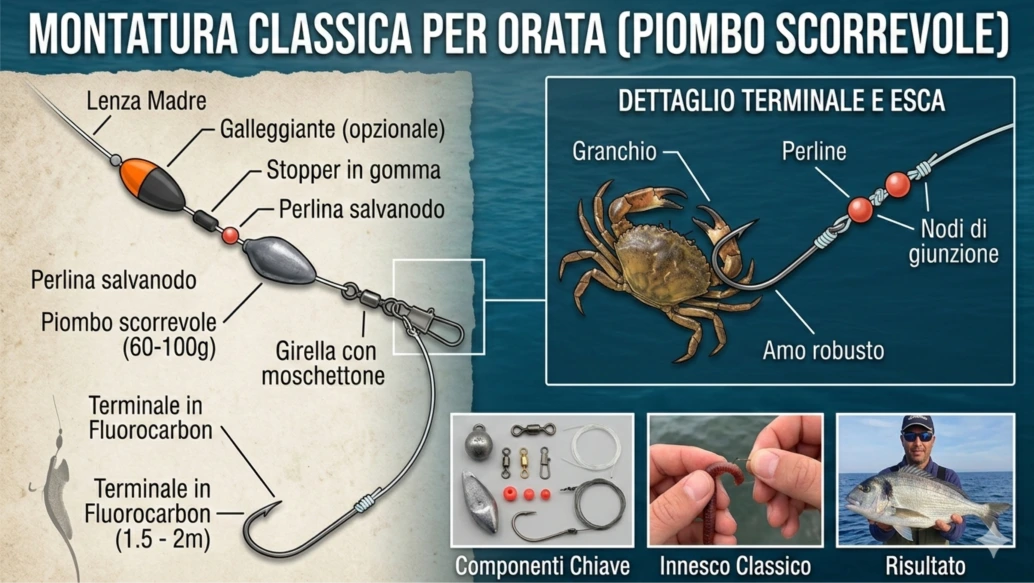 La pesca all'orata (Sparus aurata), nota come la "regina del sottocosta" per la sua astuzia e forza, richiede montature precise che rispettino il suo comportamento sospettoso.