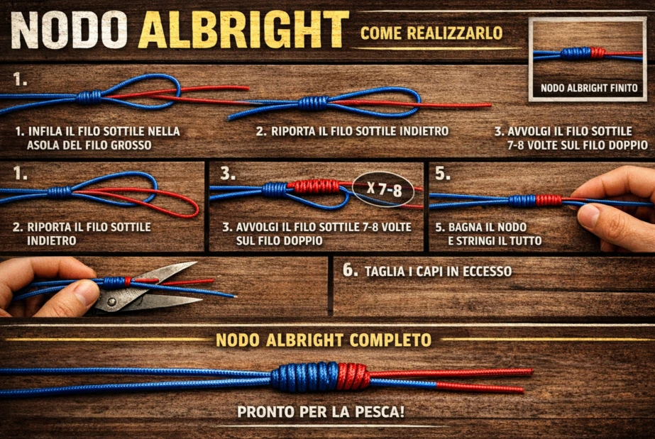 - Terminale: Fluorocarbon 1-2 m, 0,25-0,40 mm (resistente a denti).