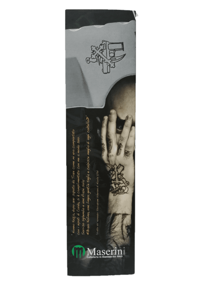 Coltello Maserin Mod 986 è veramente pezzo unico realizzato con una linea morbida ed elegante, però sotto sotto ha un potente anima guerriera, un formidabile coltello da caccia che da sopravvivenza. La coltelleria Maserin crea un coltello molto performante ideale per la caccia perchè questo, proprio il Modello 986? Questo tipo di oggetto viene chiamato anche coltello Skinner, la sua lama molto particolare ed efficace viene realizzata con una profonda inclinazione appositamente studiata sulla punta, ideale per avere e usufruire di filo lama ancora più affilato e un taglio più preciso. Il coltello Maserin 986 la lama è stata realizzata Acciaio inox N690 tagliente come un rasoio con alta resistenza all'usura e alla corrosione, il manico è stata ideato in manico legno di olivo pregiato, con un fantastica impugnatura che si adatta perfettamente alla mano di chi lo utilizza, mantenendo un grande equilibrio e stabilità anche durante il taglio. Leggero e molto robusto, con la possibilità di essere smontato tramite una monetina all'interno troverete un piccolo tesoretto dove potete inserire accessori per la sopravvivenza, accompagnato da un bellissimo fodero in cuioio. Caratteristiche Manico: Olivo Lama: Acciaio inox N690 Hrc 60 Lunghezza lama 10cm Lunghezza aperto: 21cm Peso: 204 gr Fodero: Pelle in cuoio Desain by Max Bacchilega Made in italy Acquistando il coltello dichiaro di essere maggiorenne. NOTA : Esercitando sia E-commerce, che vendita diretta al pubblico, la disponibilità del prodotto potrebbe non essere gestita in tempo reale. Nell'eventualità che dell'articolo non sia disponibile, vi verrà riaccreditato l'intero importo pagato, entro 24 ore
