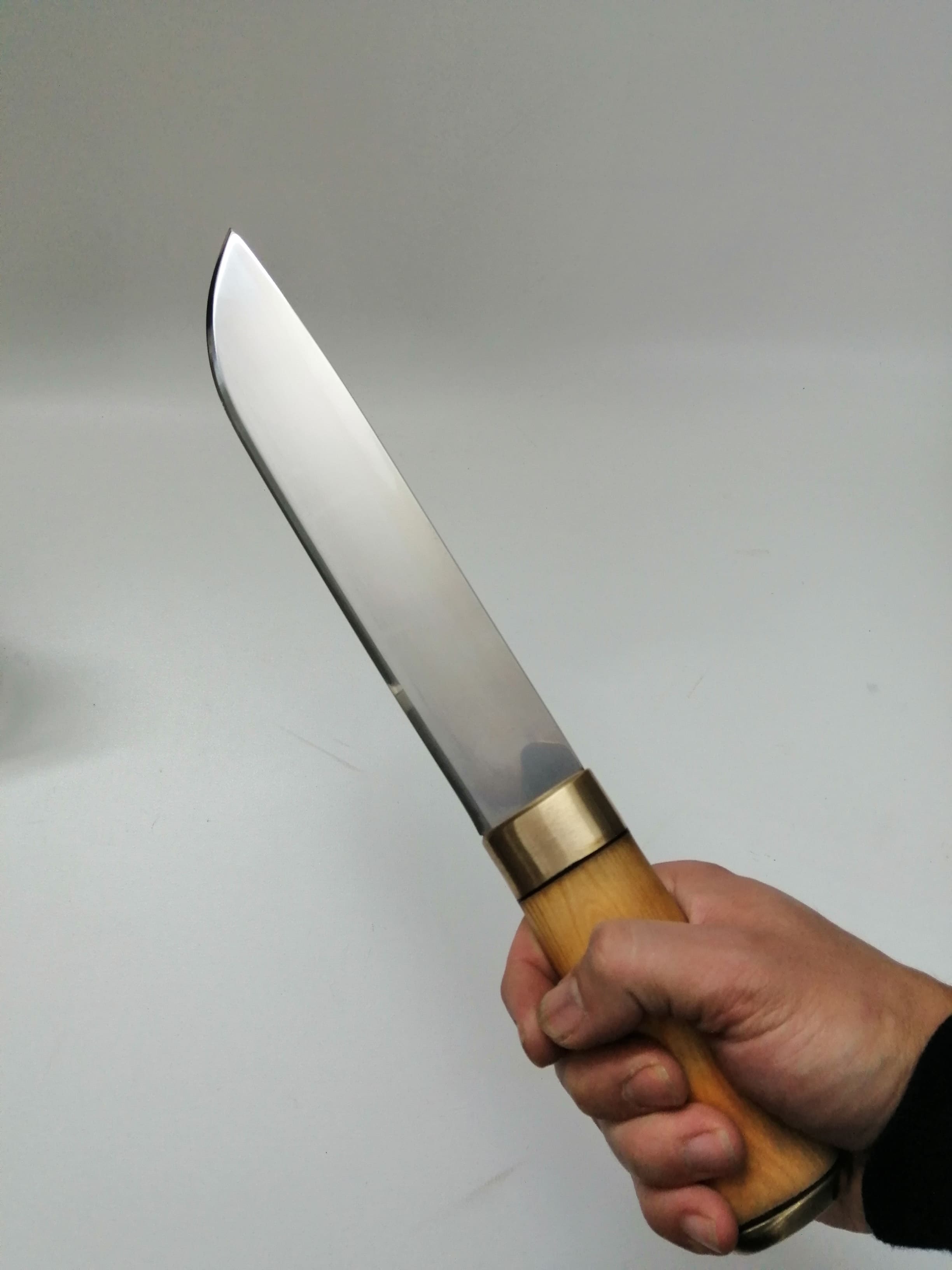 Questo coltello ha veramente delle linee che riportano in mente subito i classici coltelli norvegesi, unici ed inequivocabili, infatti er proprio il coltello da campo del popolo sami, ideato con classico manico in legno in betulla, bellissimo ed elegante con riporti in ottone per abbellirlo.