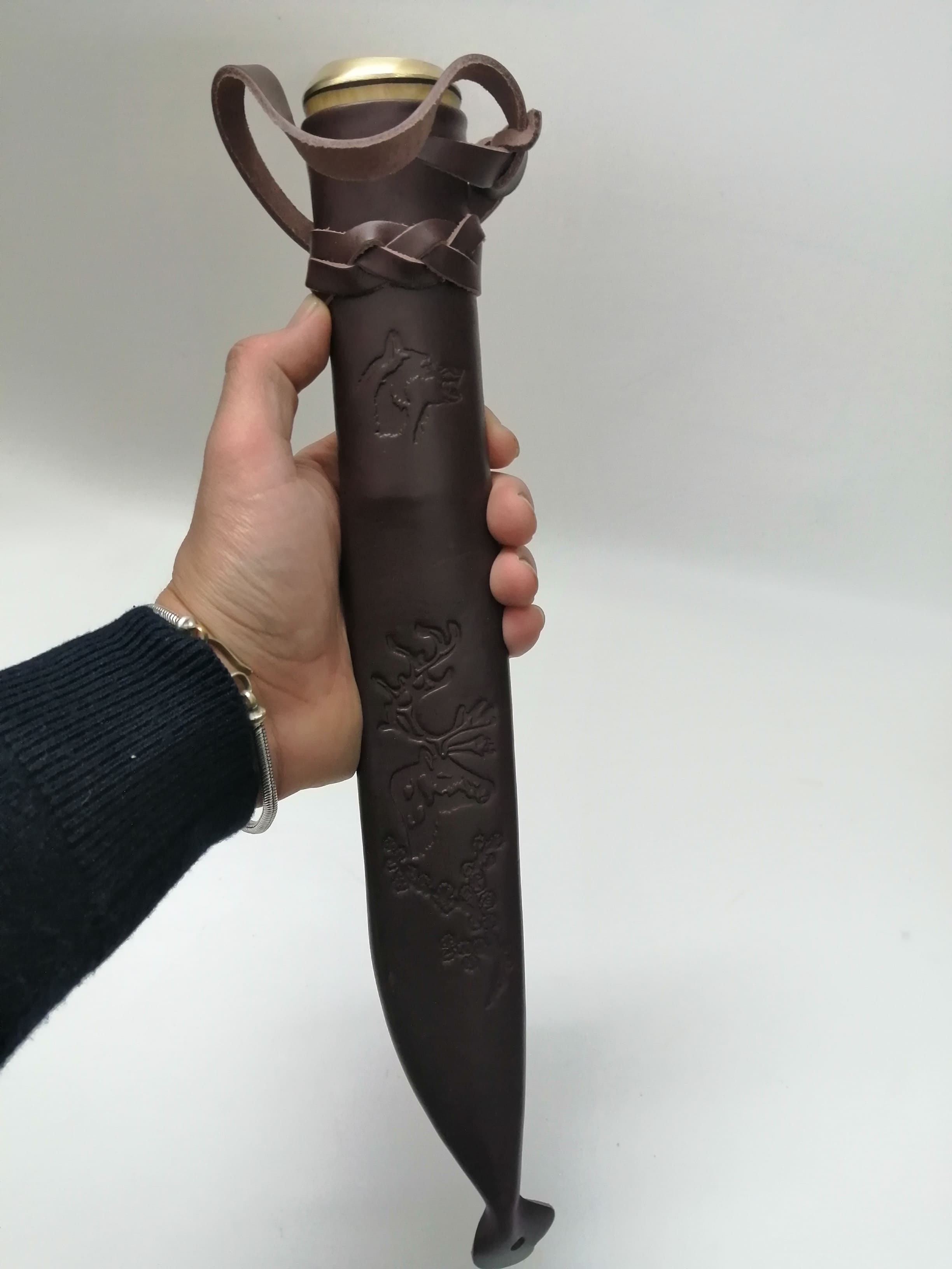 Questo meraviglioso coltello professionale viene affiancato da un splendido fodero in cuoio, inciso con dei particolari disegni tra cui un lupo e al alce.
