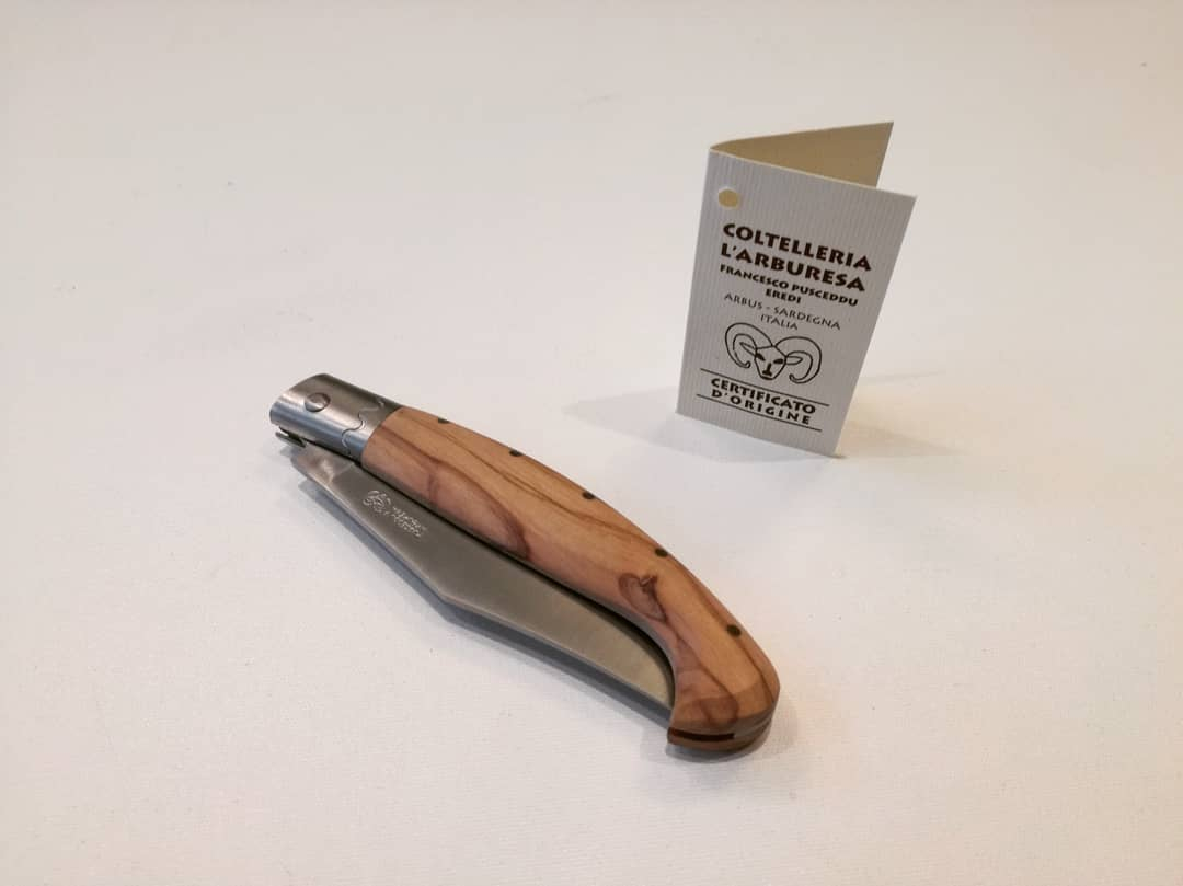 La lama del coltello tipico sardo è costruita in acciaio AISI 440/Carbonio 053 ottima e molto affilata, mentre il manico è stato realizzato in ulivo pregiato e per renderlo ancora più unico sono state applicate delle fascette in acciaio inox nel manico.