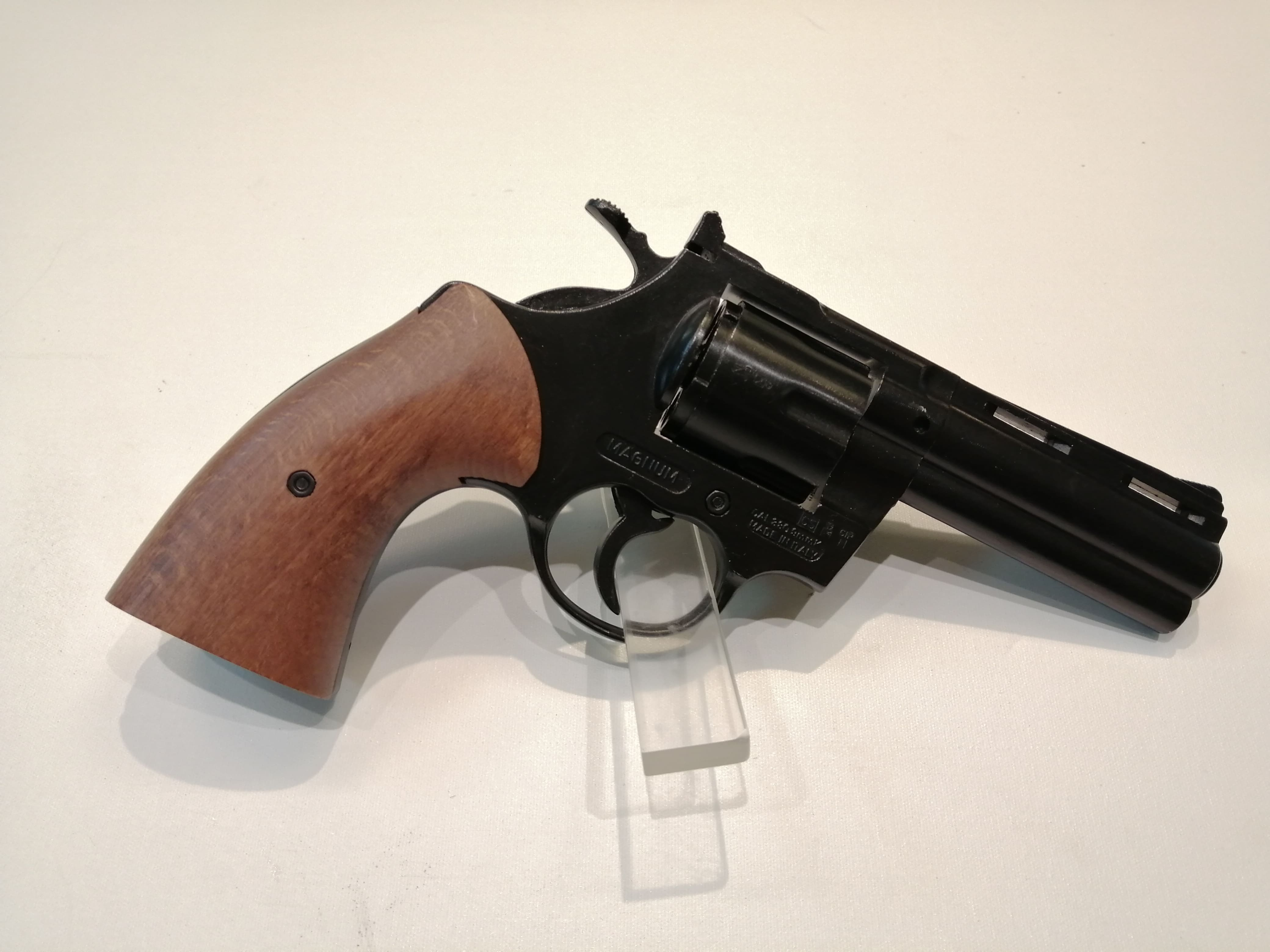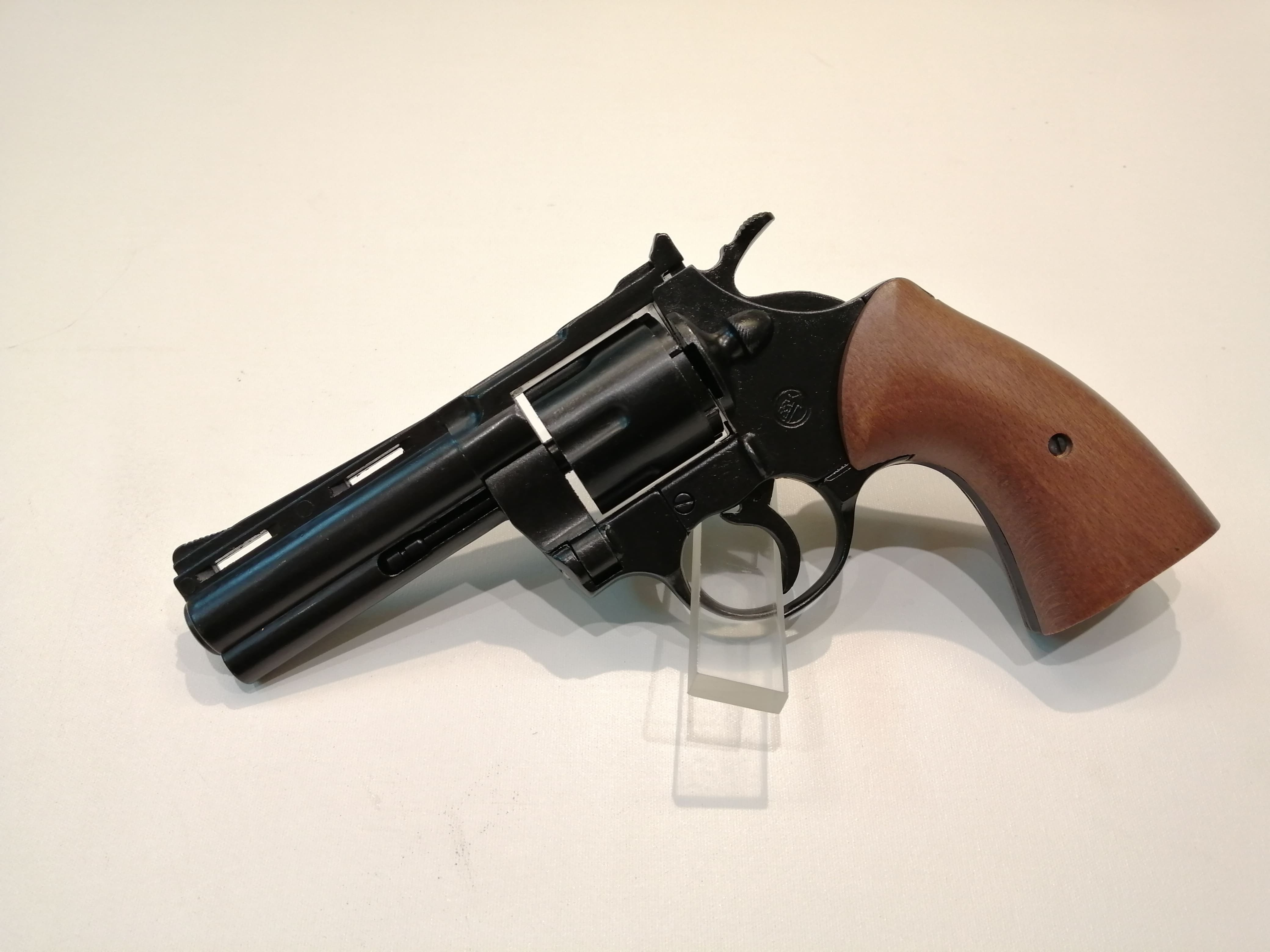 Ispirata al Colt Python 357 Magnum, uno dei revolver più amati della storia, questa versione blank firing spara cartucce a salve calibro 380 (equivalente a 9mm R.A. Knall), note per il loro rumore assordante e l'effetto visivo impressionante. Ideale come pistola da scena, grazie alla sua estetica realistica e al funzionamento top-firing (scarico verso l'alto per massima sicurezza), è utilizzata da professionisti del cinema italiano e internazionale.