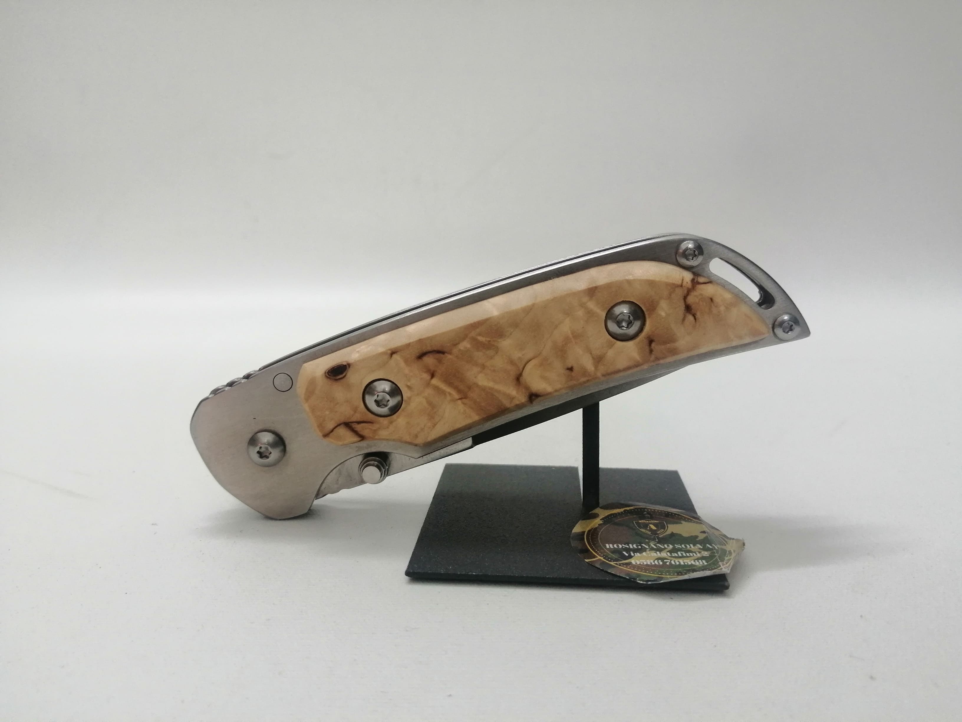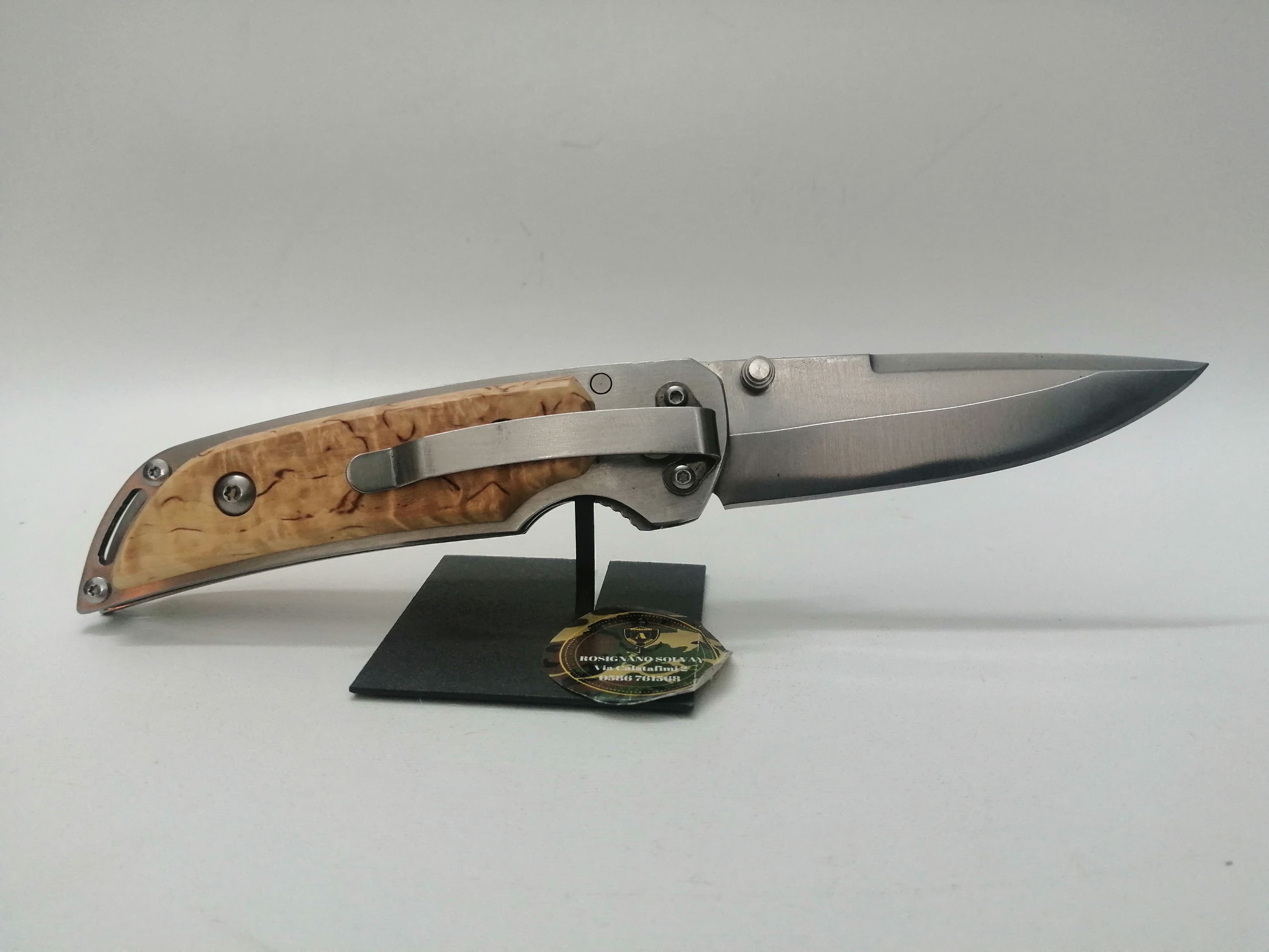 Nella parte interna del coltello ha il blocca lama di sicurezza e nella parte esterna del manico costruito in acciaio e legno di betulla a il clip per l'inserimento nella cintura.