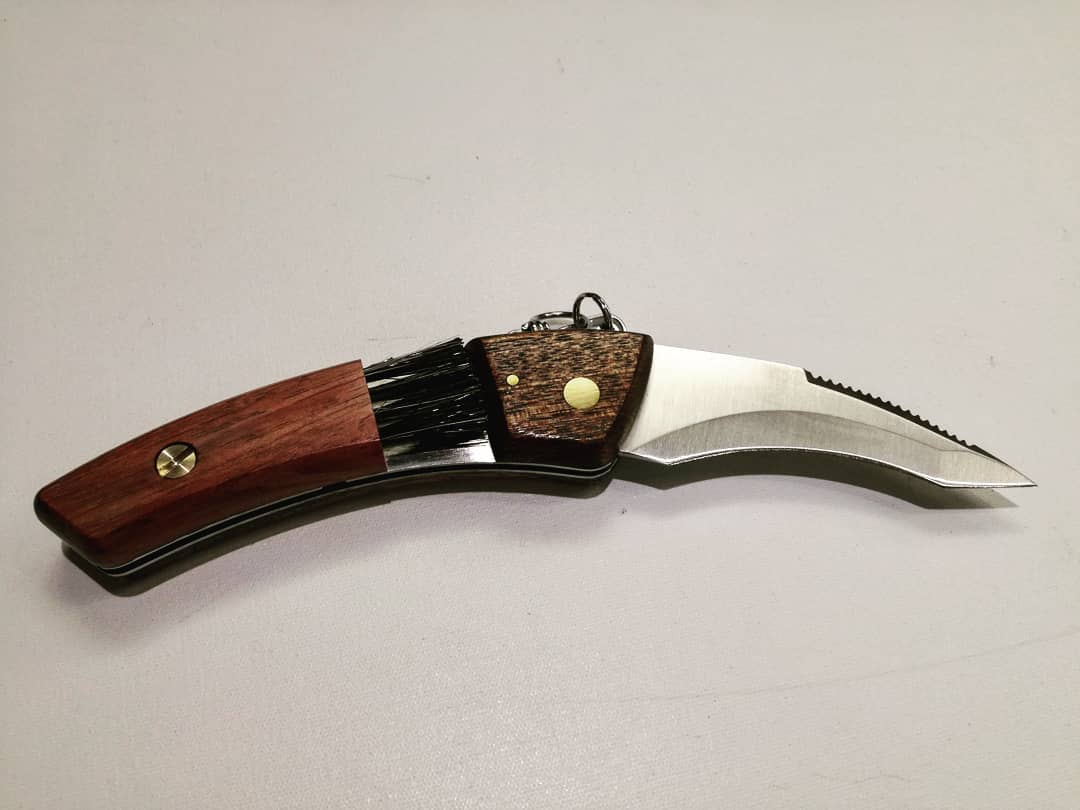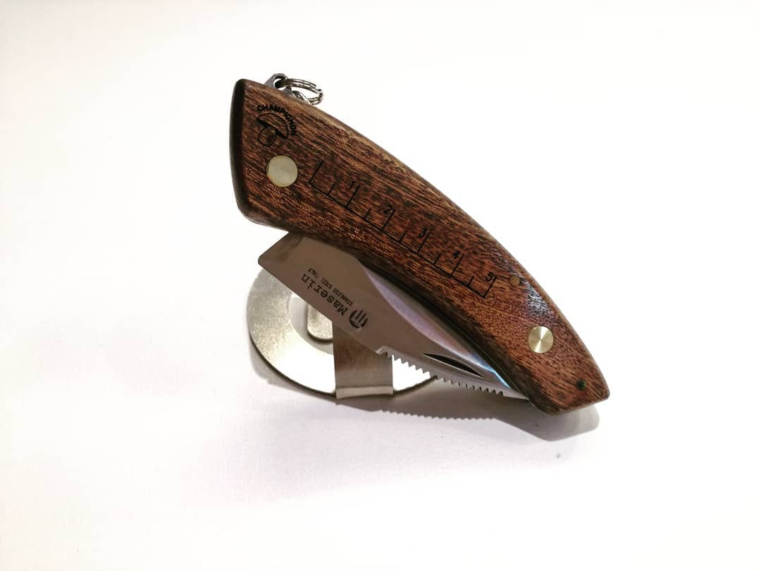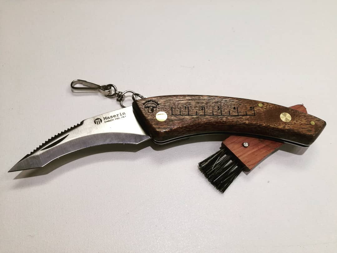 Bellissimo prodotto il coltello funghi Maserin è chiudibile su stesso e all'interno del manico dello Champignon è presente il pennellino per la pulizia in setole naturali di tasso, richiudibile sul manico, una vera opera d'arte architettonica.