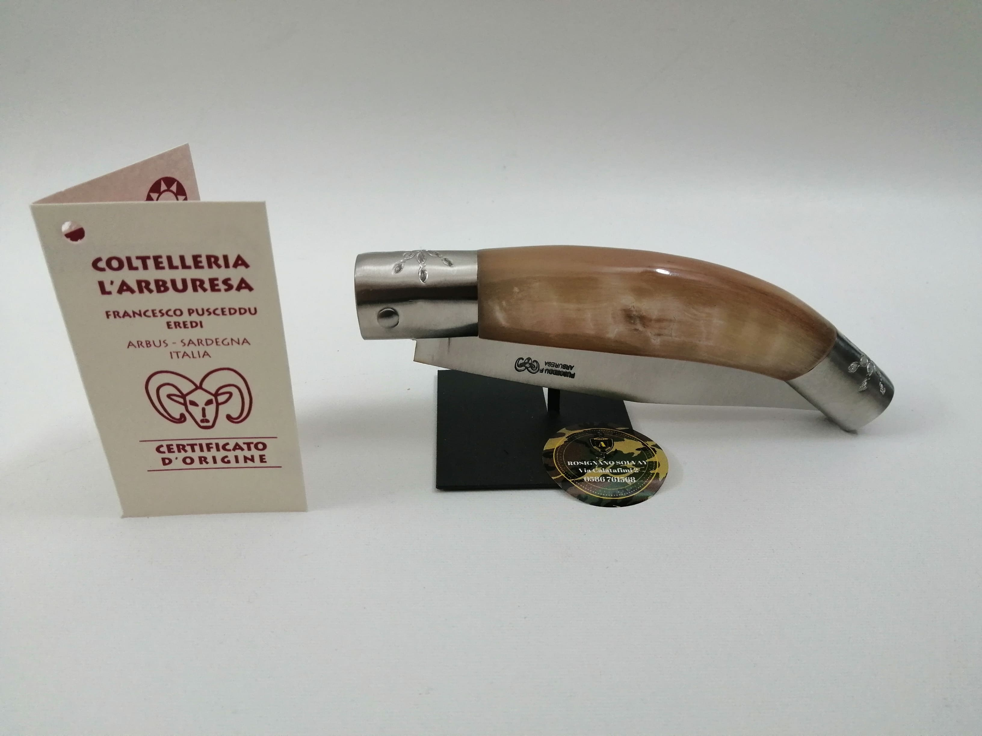 Il coltello arburese ha origini antichissime ed è stato utilizzato fin dal Neolitico dagli abitanti dell’area sardo-corsa. La sua forma caratteristica, con lama larga e dritta e manico ricurvo, lo rende inconfondibile. Storicamente apprezzato per le sue capacità di taglio e la sua robustezza, oggi è impiegato sia per l’uso quotidiano che come pezzo da collezione o souvenir di grande valore.