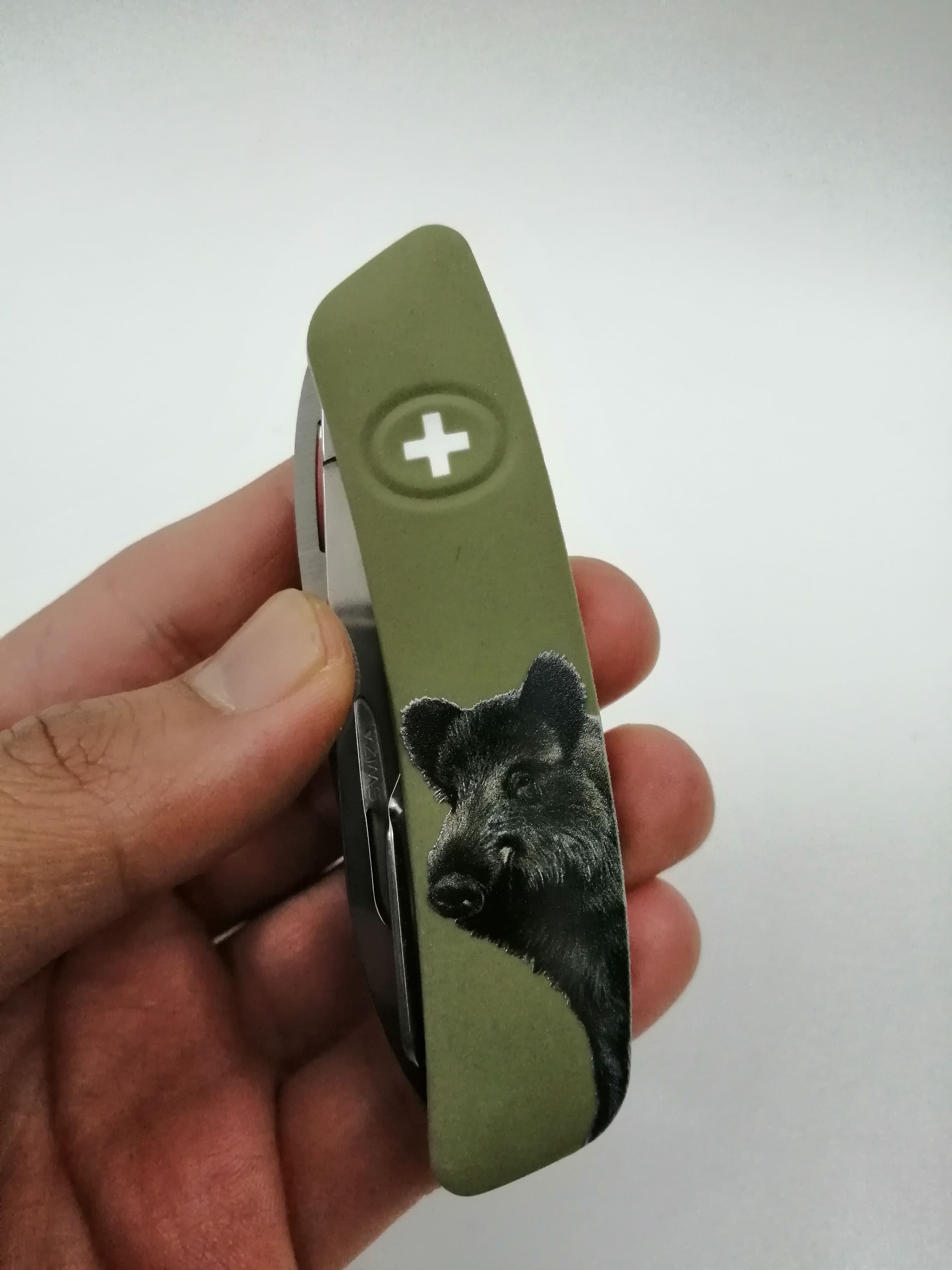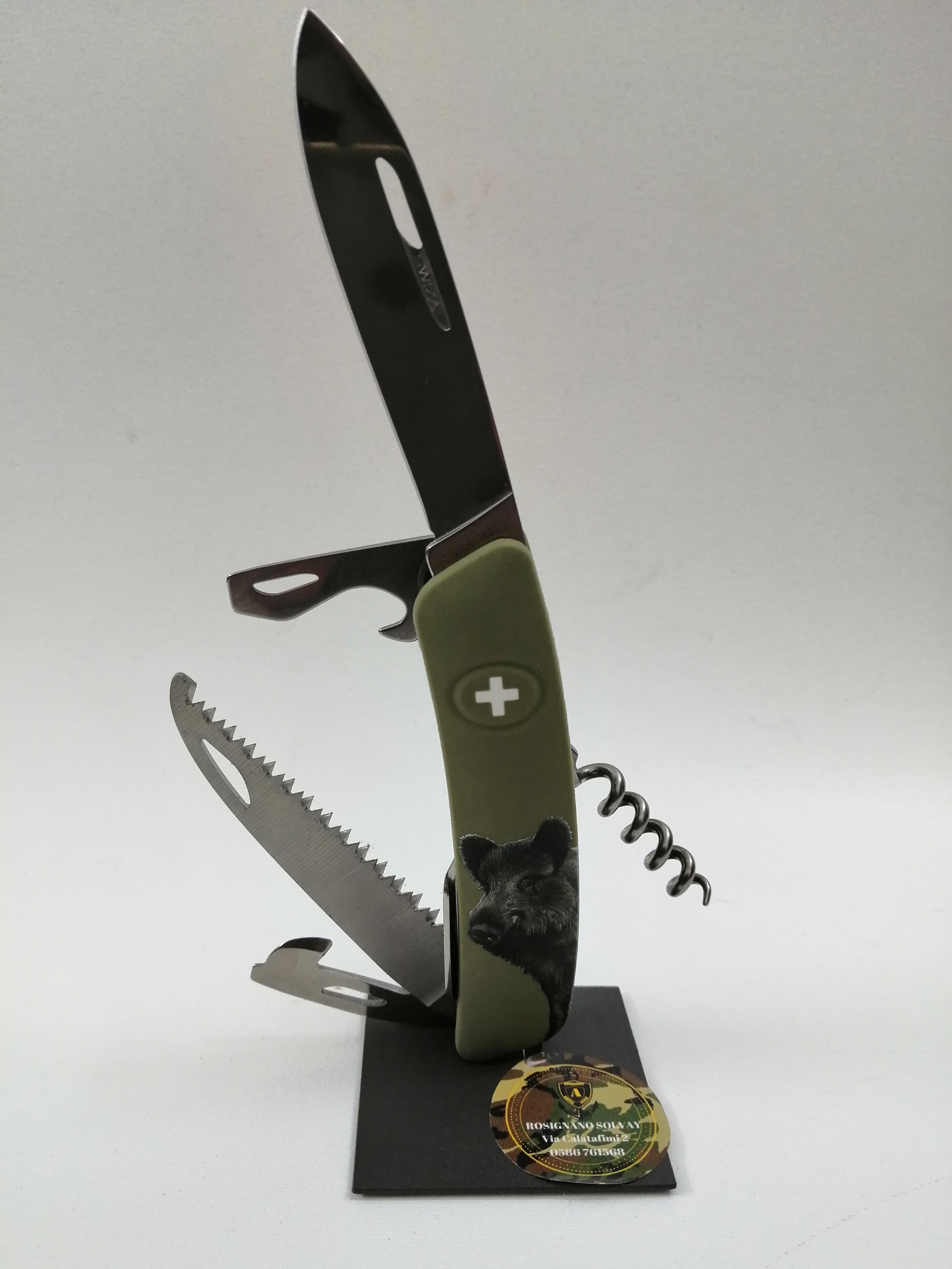 Il coltello Swiza Hunting D05  in questo caso viene disegnato sul manico un animale la testa del "Re del Bosco" il cinghiale un articolo creativo e innovativo, la lama è stata realizzata in acciaio 440 Extra Solido durezza 57 HRC ottimo con un buonissimo taglio e il manico di colore verde realizzato con un materiale morbido e antiscivolo robusto e anti graffio.