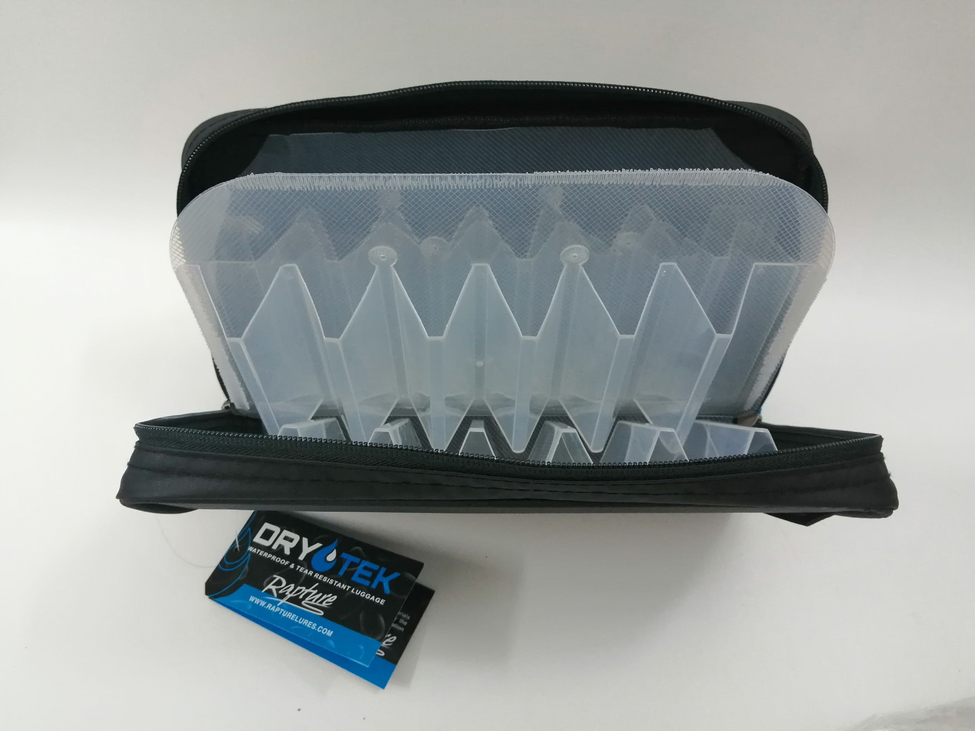 BORSA EGING RAPTURE DRYTEK un articolo per la pesca ideale per lo spinning e eging, realizzata in quattro  compartimenti rigidi separati l'uno dagli altri per contenere i vostri artificiali da pesca in perfetto ordine e sicurezza per non rischiare di bucarsi contro le ancorine.