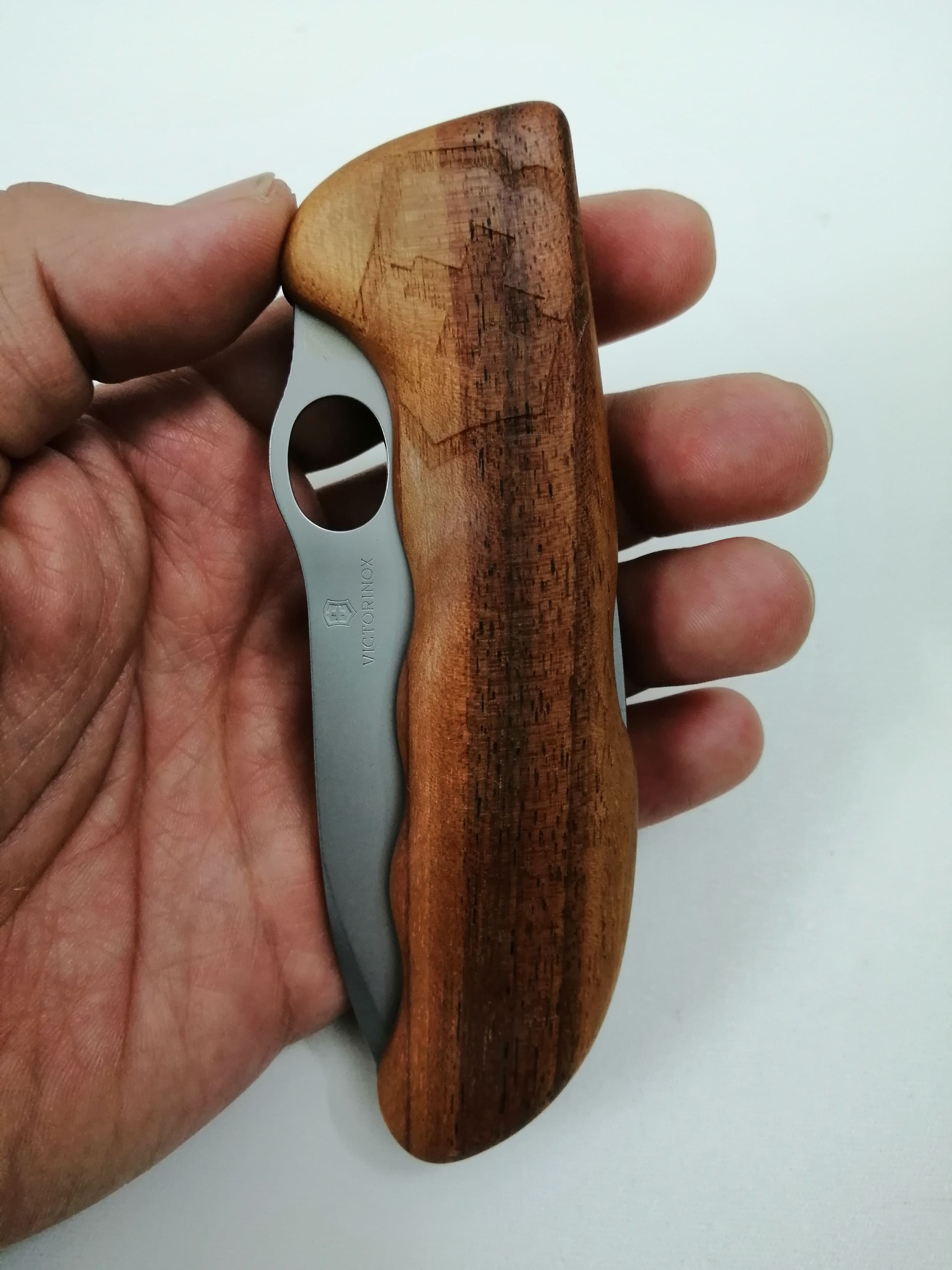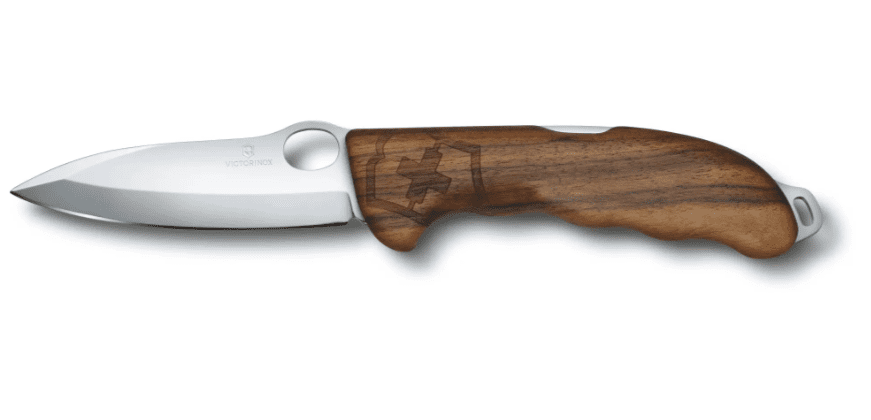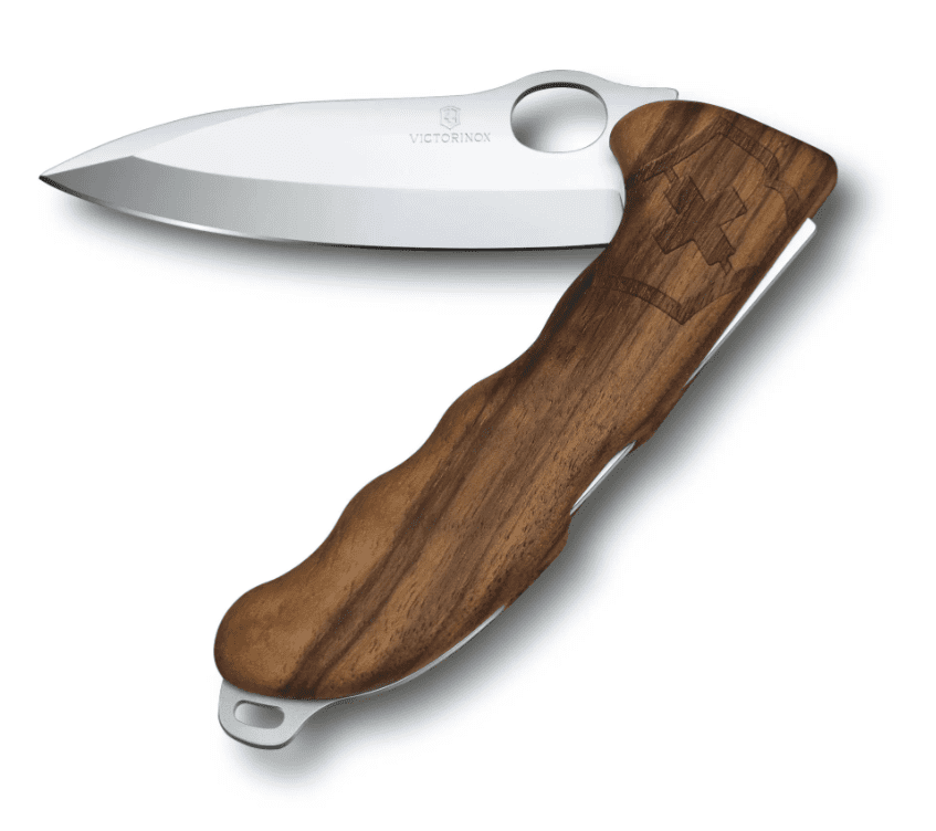 Il manico del coltello Victorinox Hunter Pro è stato costruito in legno di noce, realizzato per tutti i passionisti per la caccia che richiedevano un lama più possente ed robusta, molto bilanciato ed estremamente tagliente con un bel blocco lama rivolto sul dorso del coltello.