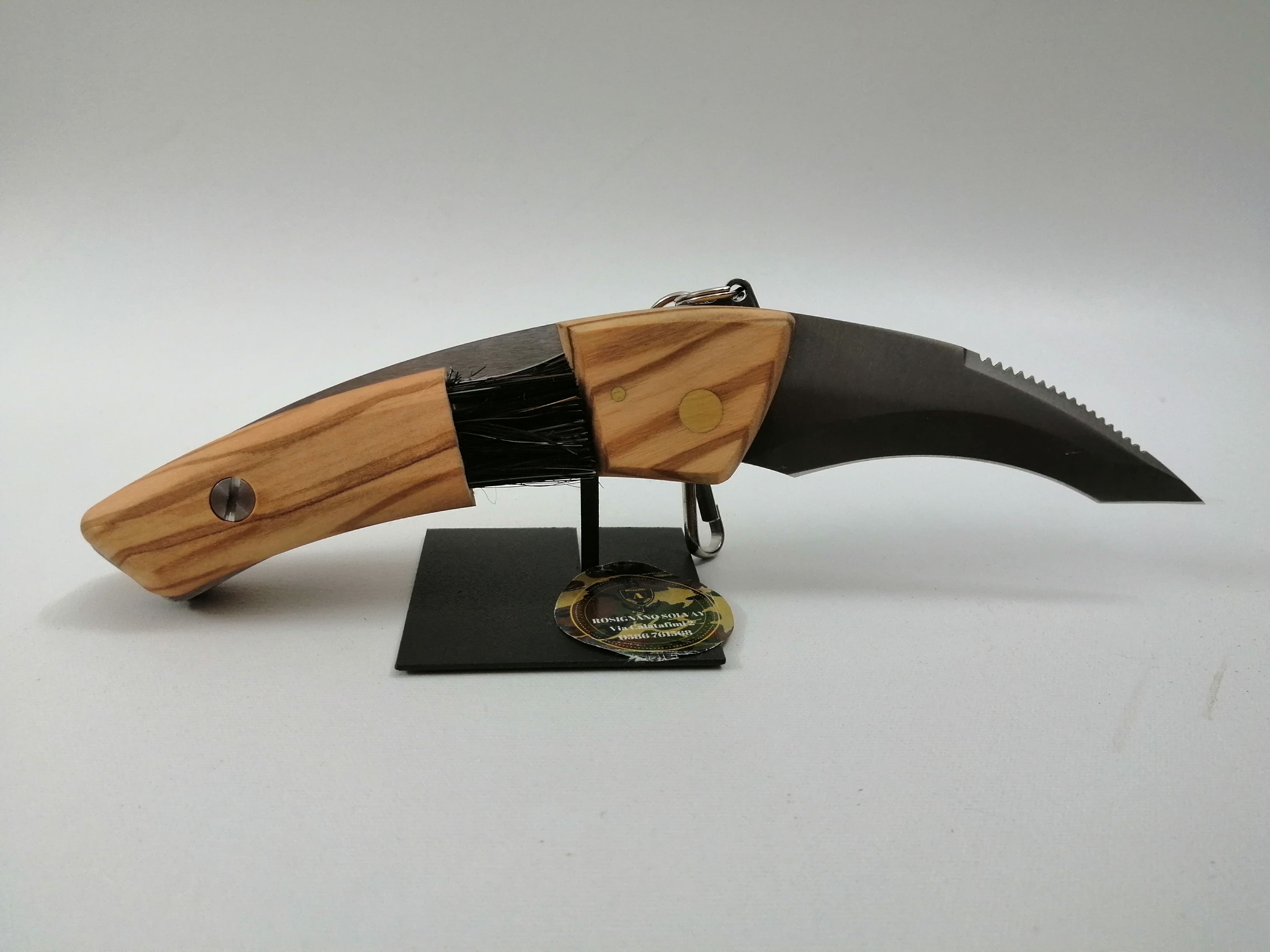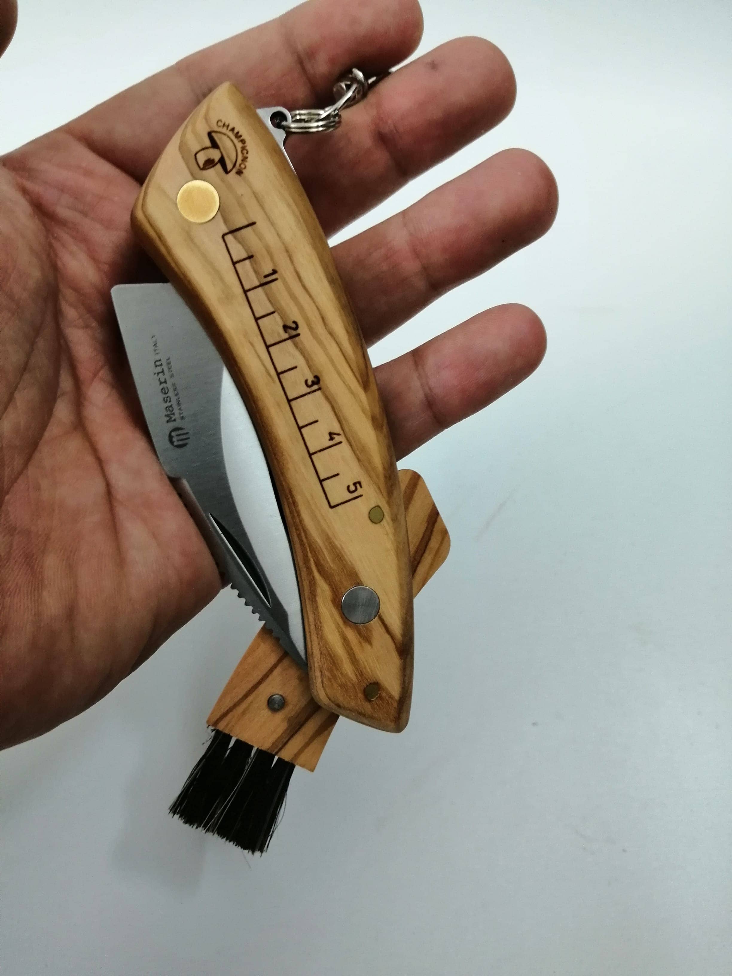 IL manico del coltello per funghi con spazzolino Maserin è stata costruito in legno di Olivo di prima qualità, molto comoda l'impugnatura che avvolge tutta la mano, all'interno della manicatura possiamo trovare a scomparsa un piccolo pennellino per la corretta pulizia del fungo in setole naturali di tasso.