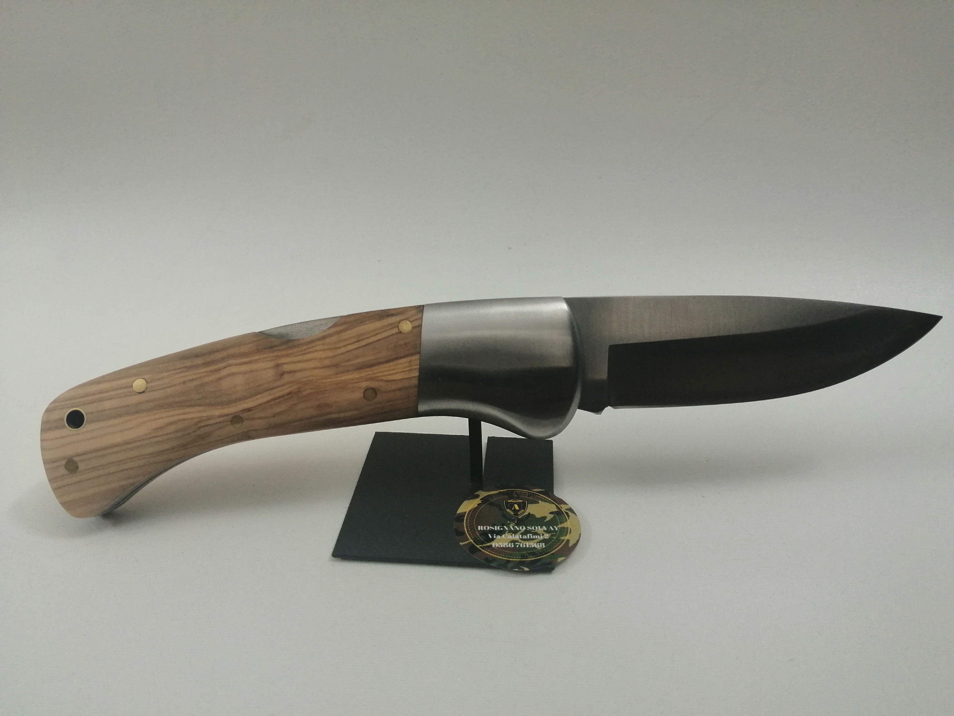 Il manico del coltello è stato realizzato in legno naturale di olivo con delle belle sfumature ed è molto maneggevole come si pone sulla mano per afferrarlo.