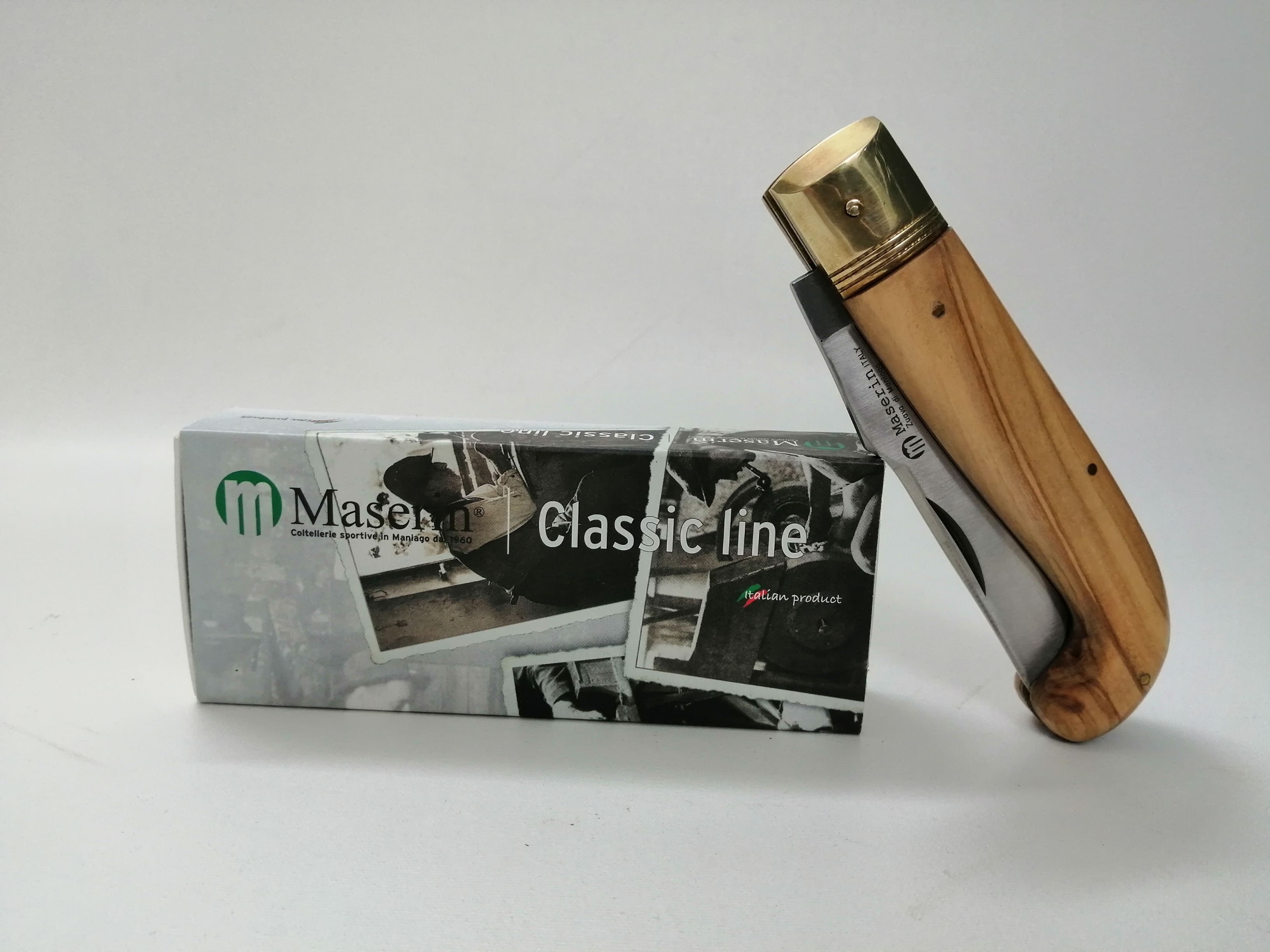 Un coltello a serramanico molto pratico e affascinante, creato con bellissimo manico di legno di olivo naturale, con delle magnifiche venature in risalto, ottima l'impugnatura con bella presa per la mano con una curvatura molto particolare del manico rivolta verso il basso, con parti in ottone per decorarlo e dandogli i ancora più splendore.