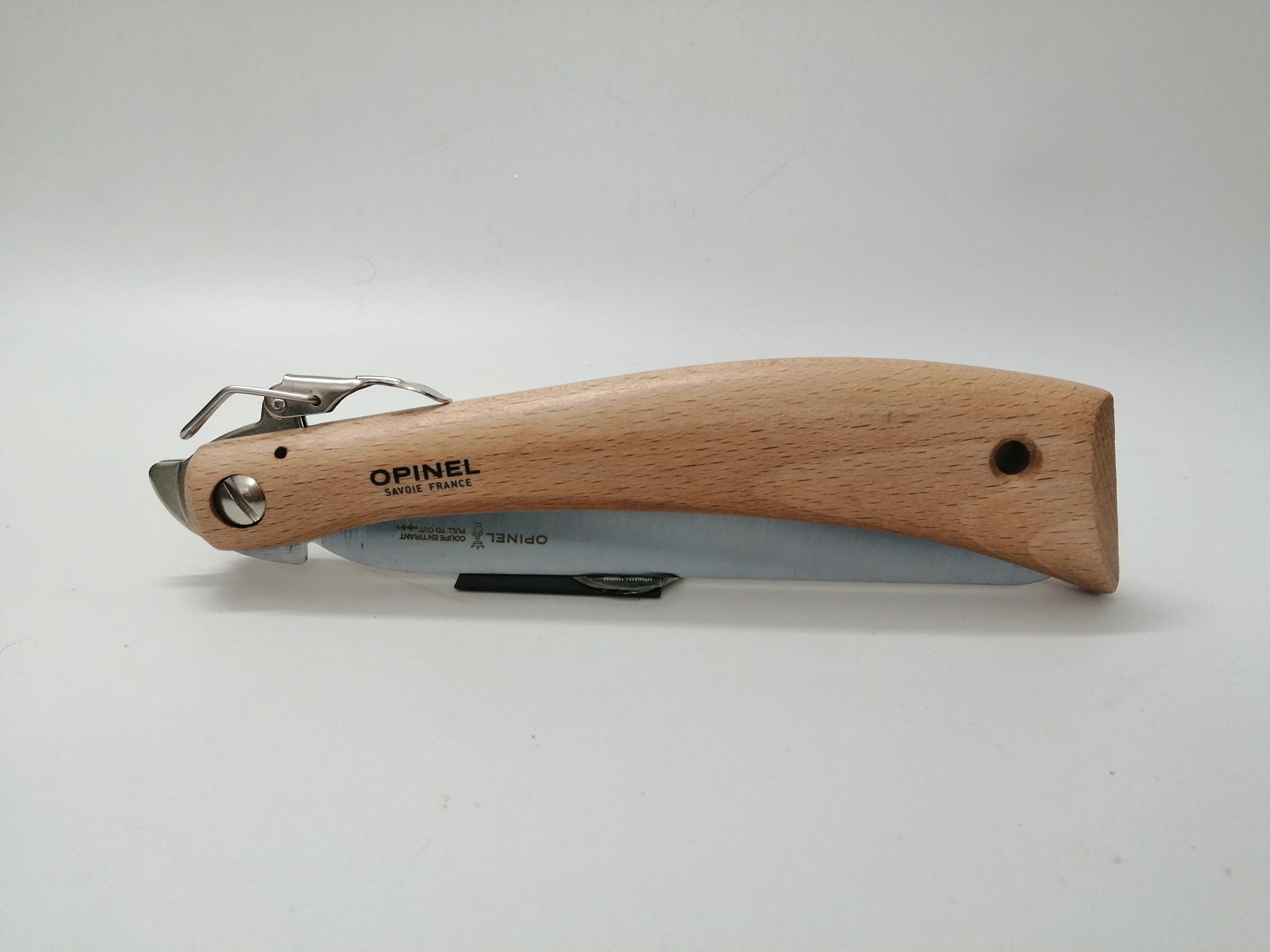 Il manico del seghetto richiudibile Opinel è molto tenace a graffi e urti, non che realizzato in legno di faggio, molto caratteristico dato il suo colore chiaro con parti giallastre e rosee, verniciato appositamente per essere garantire una duratura maggiore nel tempo anche da sporco e umidità.