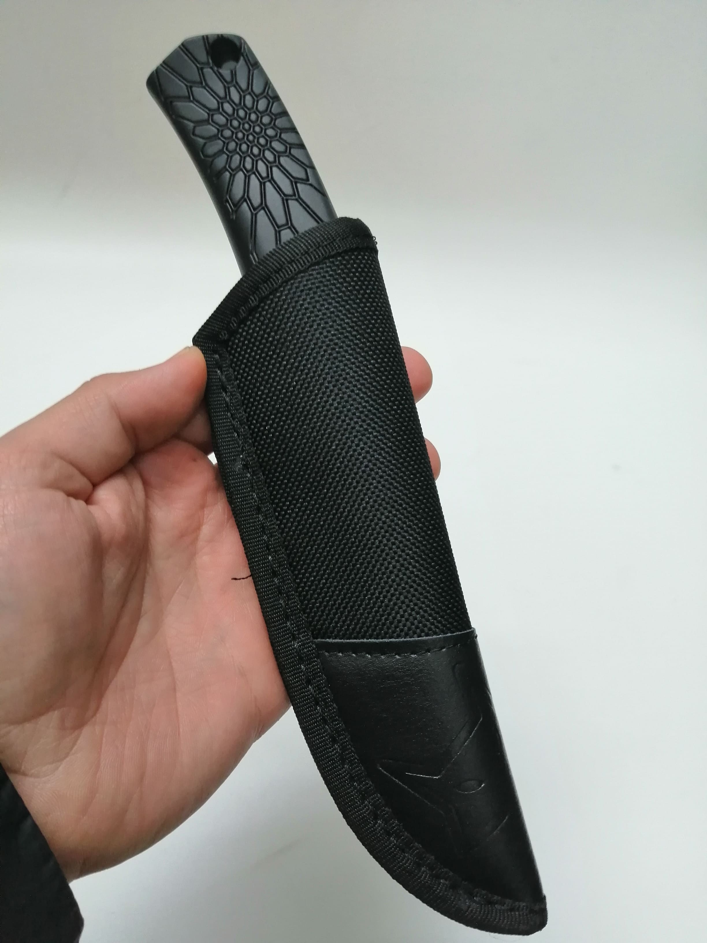 Il coltello viene accompagnato da bellissimo fodero misto cordura e pelle, praticissimo da inserire alla vostra cinghia del pantalone con la possibilità in caso di emergenze di poterlo staccare tramite un semplice bottone a clips.