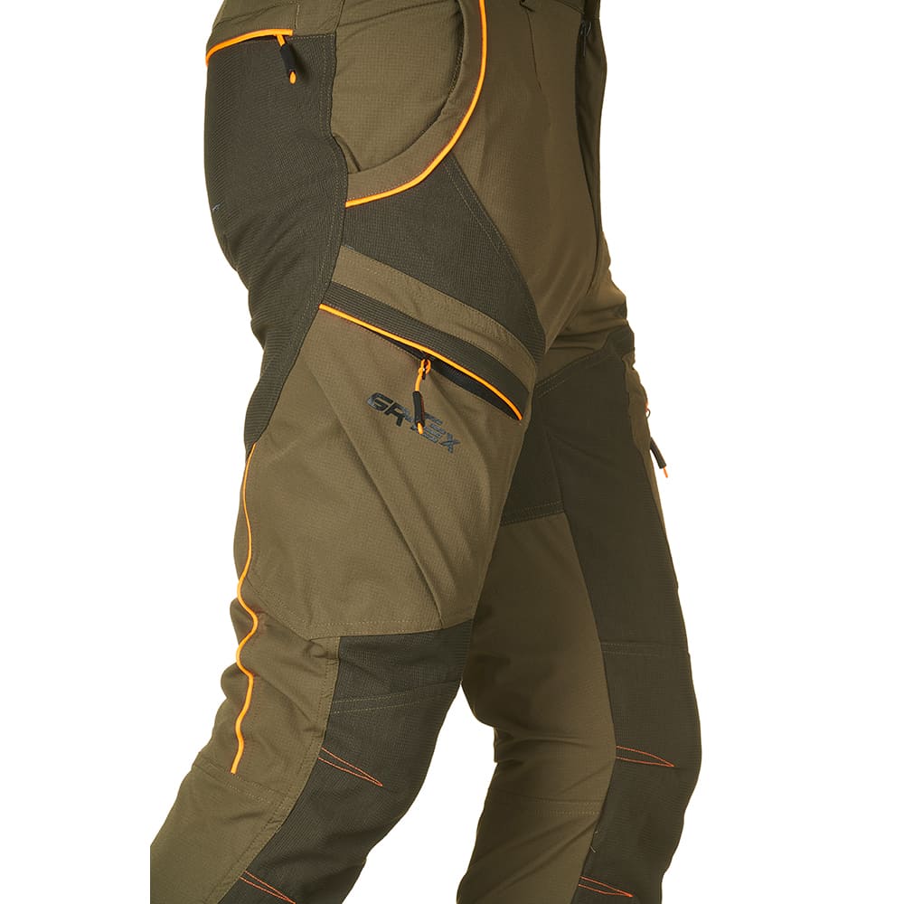 La parte maggiore esposta dei pantaloni come ad esempio la parte collo del piede fino all ginocchio, è stata rinforzata con un tessuto molto tecnico il GR-TEX, di grandissima robustezza mantenendo le qualità del pantalone senza appesantirlo e a disporre delle su più grandi qualità tra cui la sua semplicità nei movimenti grazie all'inserimento al tessuto elasticizzato.