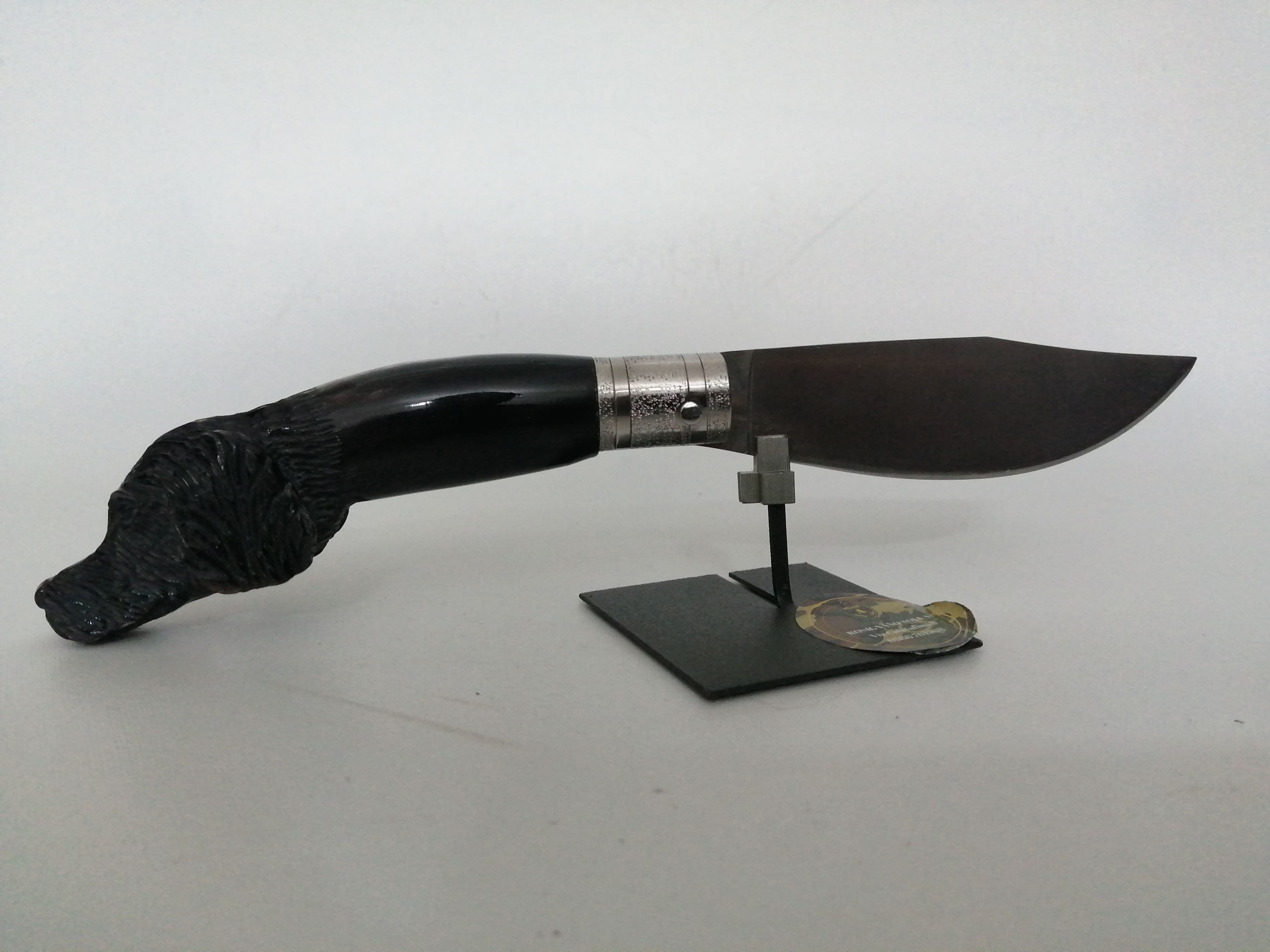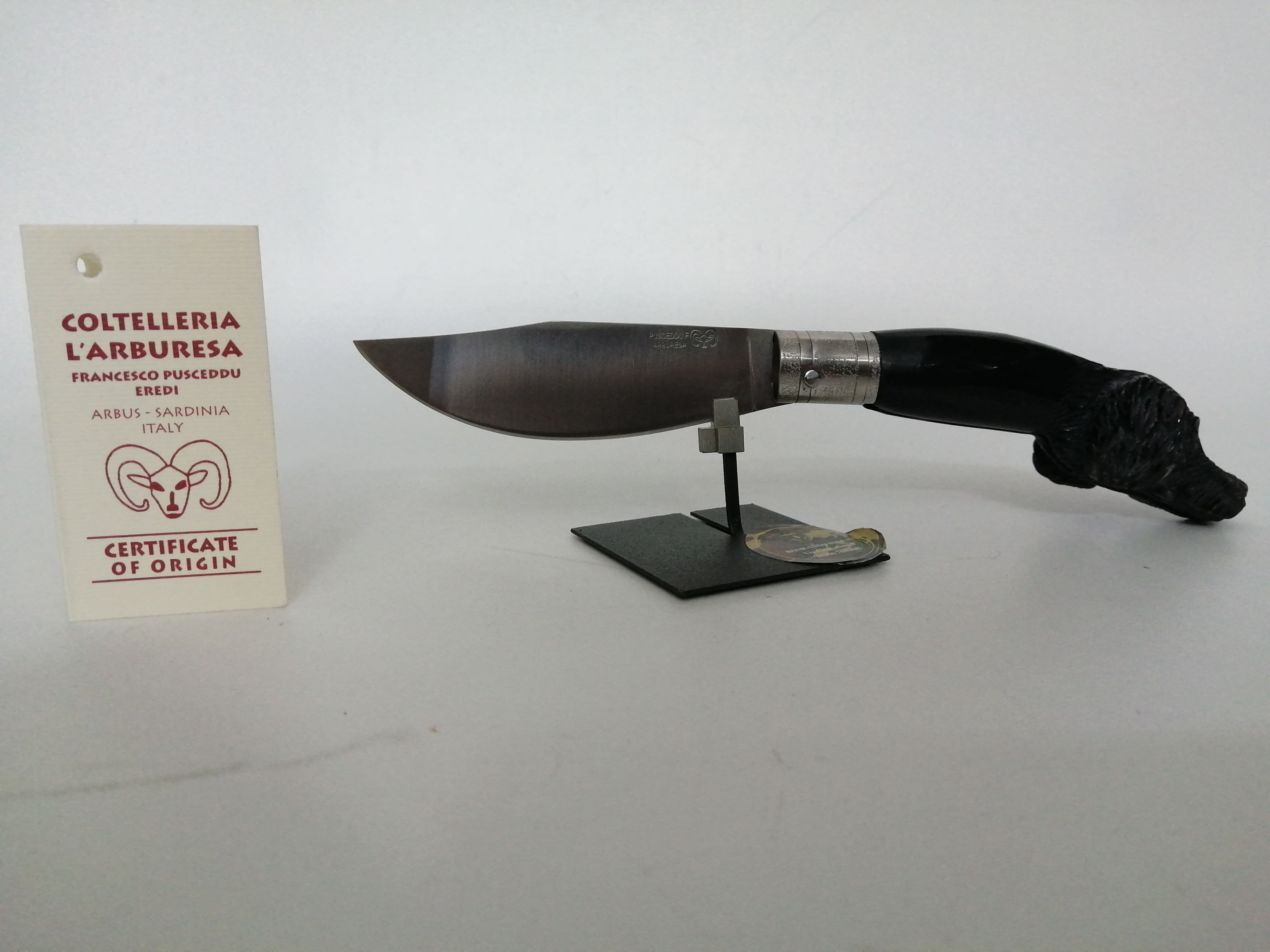Gli eredi Pusceddu F orami presenti nel mondo della coltelleria italiana da oltre 50 anni regalandoci pezzi originali e unici veri capolavori artistici in questo caso abbiamo una bellissima e ammaliante rappresentazioni di cane Setter realizzato a mano su un manico in corno di bufalo, dettagli veramente sensazionali espressi dalla espressione che anno riportato sul muso del cane.
