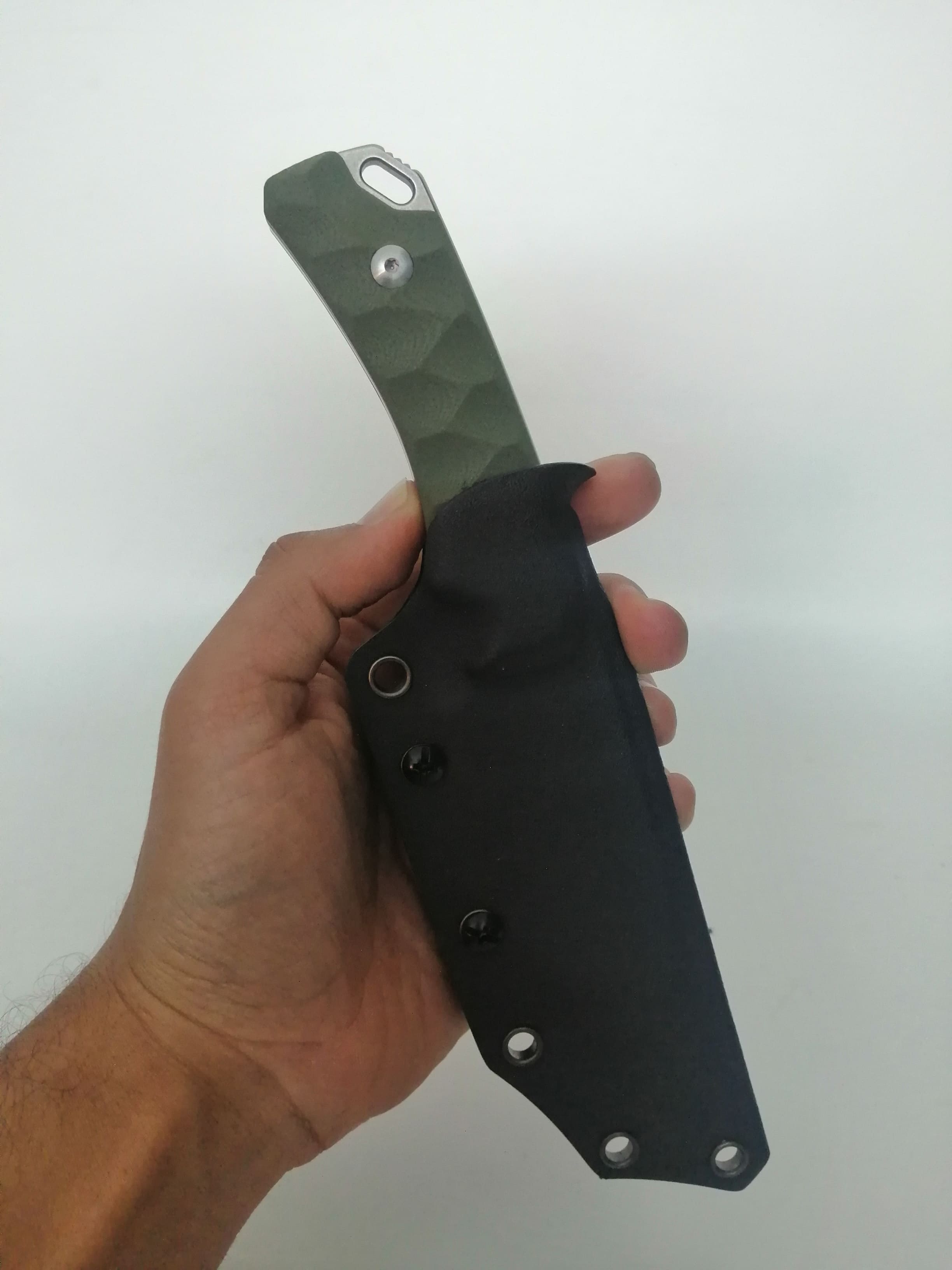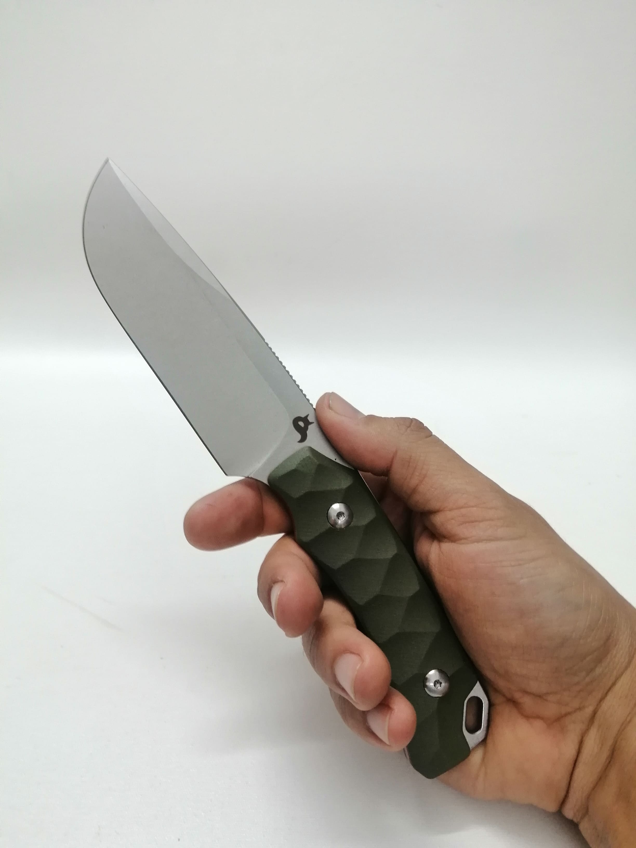 Il coltello a lama fissa Lynx è leggerissimo, in mano aderisce perfettmanete con eccellente grip sul palmo della mano, le guancette del coltello sono state realizzate in G10 OD green una materiale favoloso dalla robustezza incredibile da urti o graffi, non prende odori ed è di facilissima pulizia.