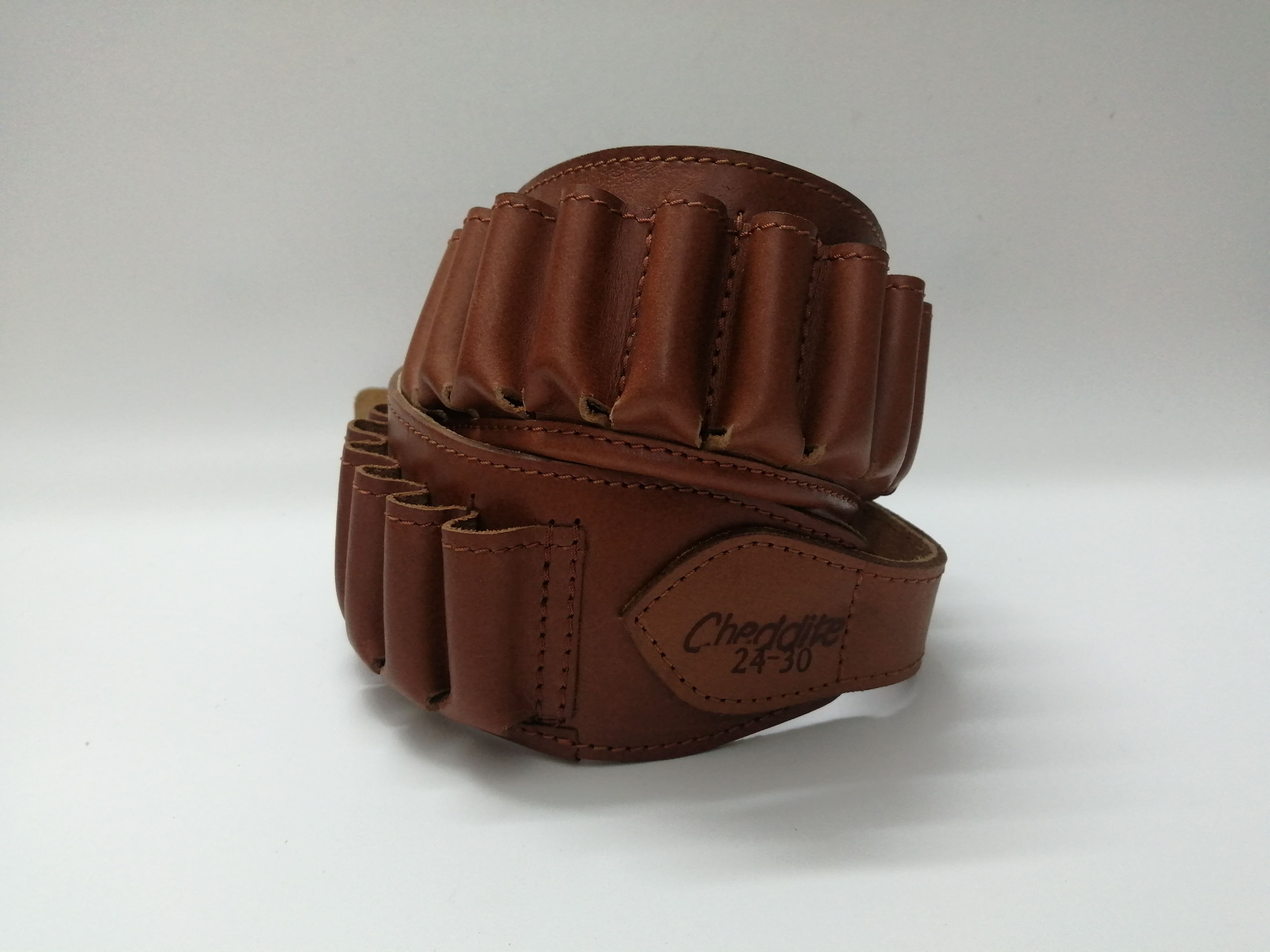 CARTUCCERA CAL 24 IN PELLE 30 CELLE CHEDDITE, progettata per contenere fino a 30 celle di cartucce calibro 24 per fucili a canna liscia.