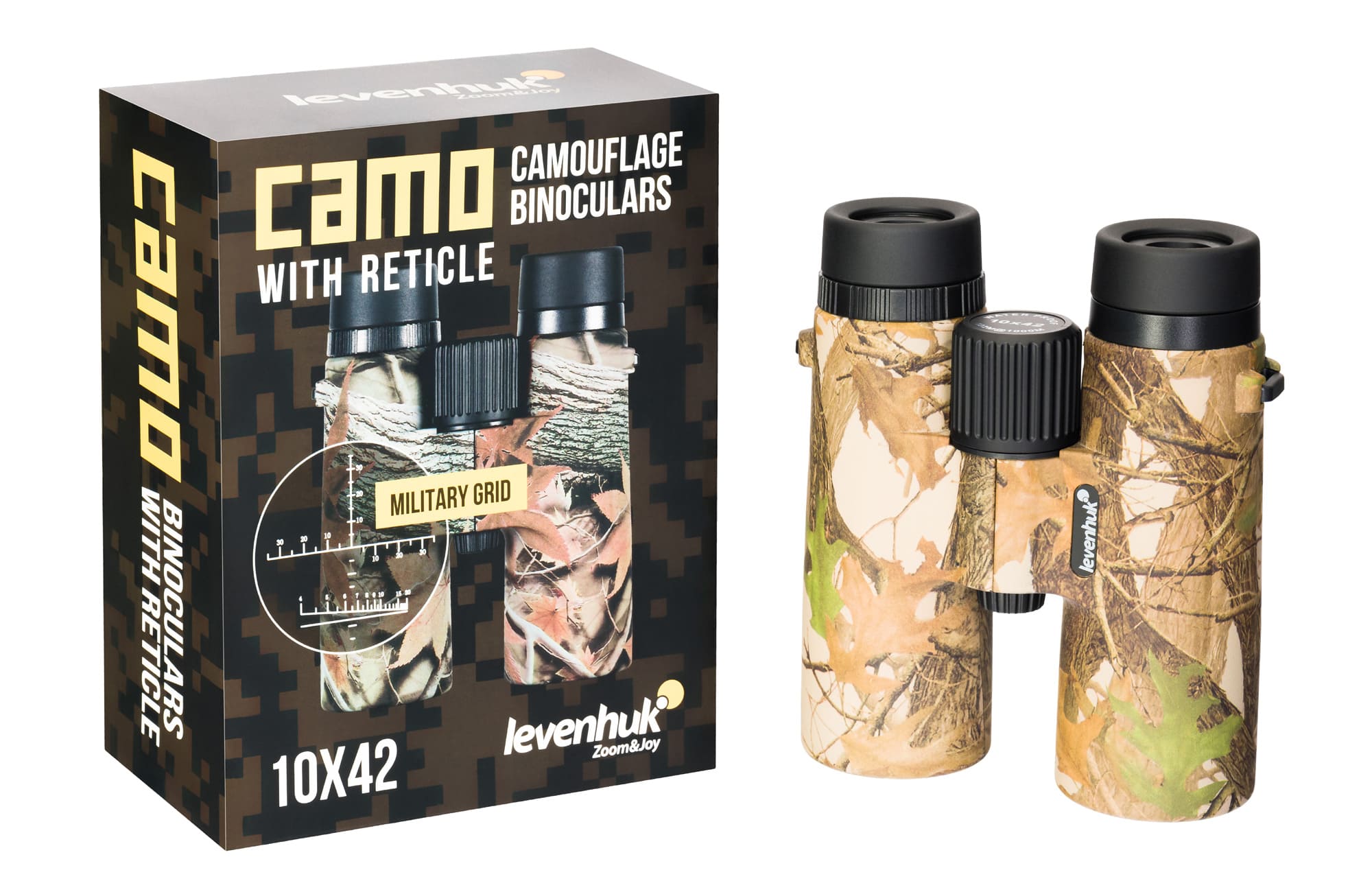 Binocolo compatto mimetico Levenhuk 10x42, prodotto dal design moderno e stupefacente creato con 6 colorazione accattivante, uniche tra loro.