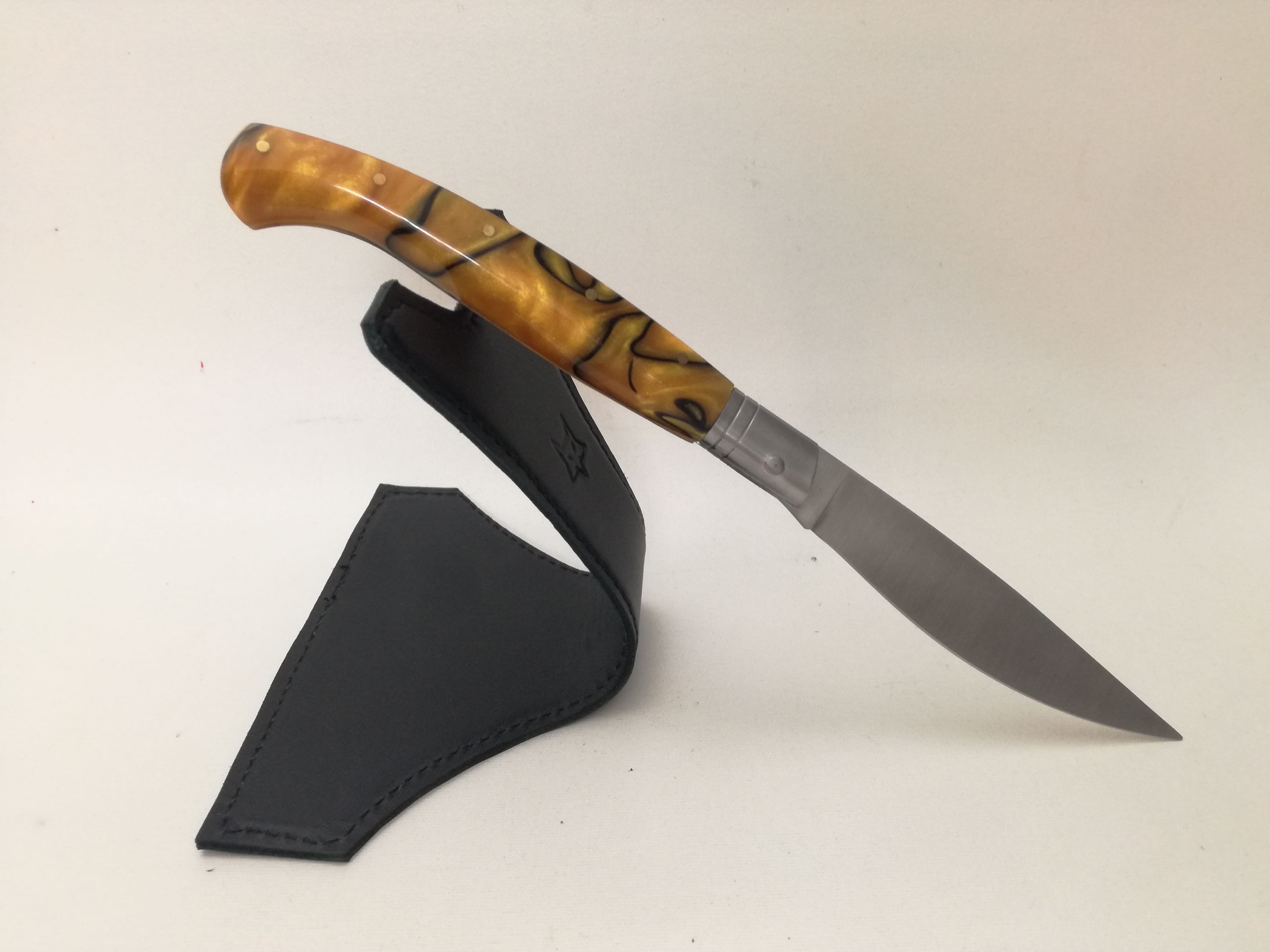 Il coltello è stata abbinato con una manicatura molto particolare, realizzato in resina acrilica colorata con varie sfumature, resistentissimo leggero, impermeabile ad acqua e altri eventuali tipi di liquidi.